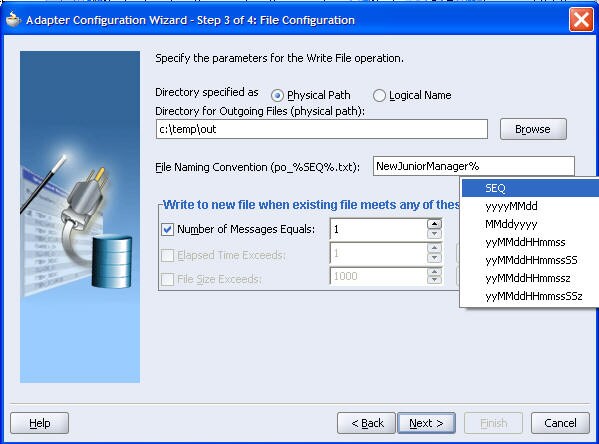 Step 3 asks you to specify the output directory and naming convention for the file the service will write. For now take the easy approach by specifying a hardcoded directory - not the best way to get your service to be portable, obviously. The filename can be specified using several dynamic elements - but only one at a time - such as the date or date time of the message or the sequence.