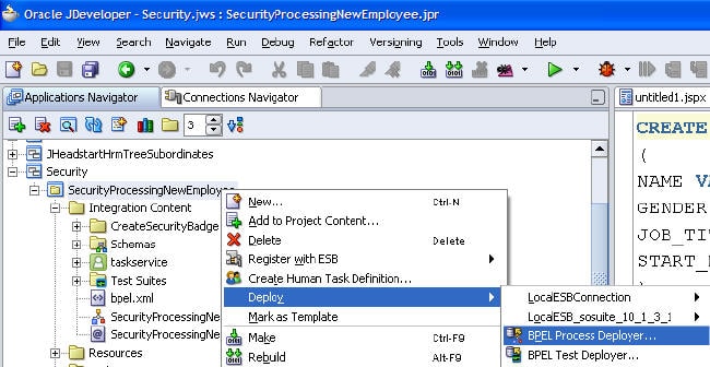 - Load the SecurityProcessingNewEmployee project in JDeveloper 10.1.3.1. Deploy the project to the BPEL PM in your SOA Suite instance. We need to have this BPEL process available when you develop the EDA Service in the ESB.