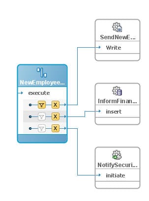 The implementation of this simple business event service using the Oracle ESB could look something like the following: