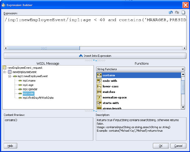 /inp1:newEmployeeEvent/inp1:age < 40 and contains('MANAGER,PRESIDENT,