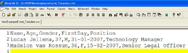 - Copy the file NewEmployeeEvent_Template.csv to a directory that is accessible from JDeveloper. You will use this file in the File Adapter Wizard, to model the file that should be written by the ESB Service you will develop in this tutorial.