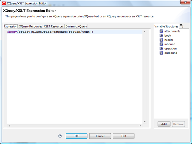 Figure 13: Defining an expression in the XQuery/XSLT Expression Editor to retrieve the Proxy Service's response