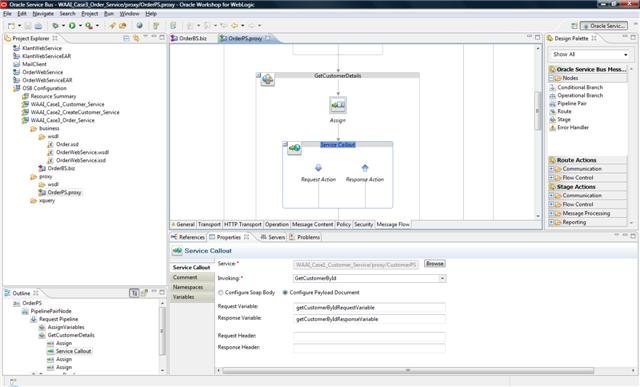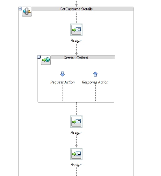 The next step is to define a Service Callout to the "GetCustomerById" operation of the CustomerProxyService to gather the required customer information. A Service Callout is used to configure a synchronous (blocking) callout to an Oracle Service Bus-registered Proxy or Business Service. When Oracle Service Bus makes a call to a service via a Service Callout action, the content of the message is constructed using the values of variables in the message context.