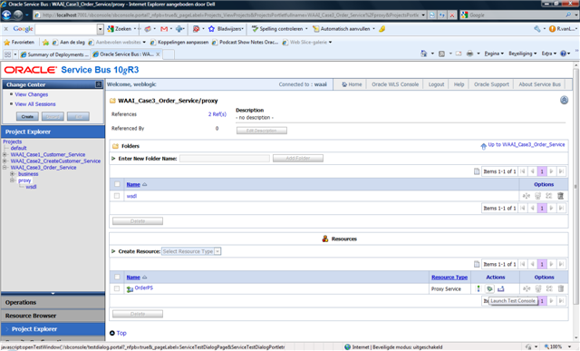 Deploy the OSB project to WebLogic Server as outlined before and open Oracle Service Bus Console. Click "Project Explorer", expand the "WAAI_Case3_Order_Service" project, and browse to the "proxy" folder. Use the "Launch Test Console" icon to test the OSB project.
