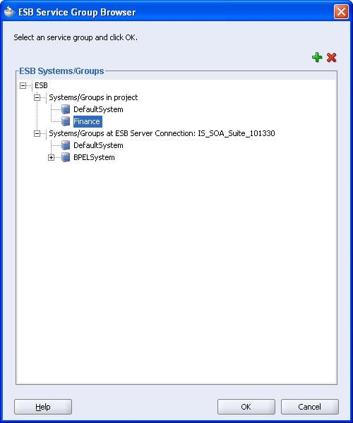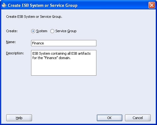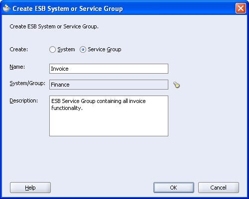 Select the system Finance that was created in the previous step and click OK. Back in the Create ESB System or Service Group dialog box, enter Invoice as name, possibly provide a description, and click OK to create the new service group.