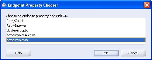 6. Open the file adapter from the ESB Designer by double-clicking it. Expand the Endpoint Properties and use the green + icon to add a value. In the Endpoint Property Chooser dialog box, select acmeInvoiceIn. In the value column, enter a location on your file system from which the example input files will be read—for example, C:/Temp/Acme. This must be an existing directory.