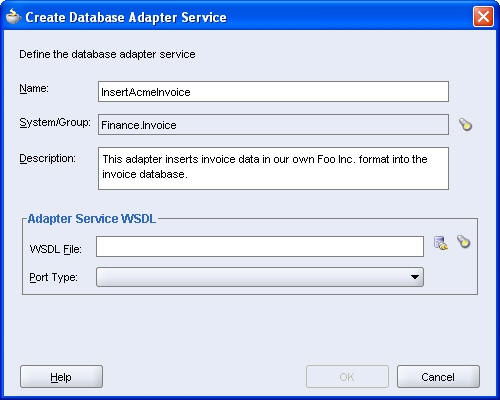 2. In this window, enter InsertAcmeInvoice as the service name and possibly add a description. Make sure that Finance.Invoice is selected as containing System/Group. If it is not already selected, use the flashlight icon to select the appropriate system and service group.