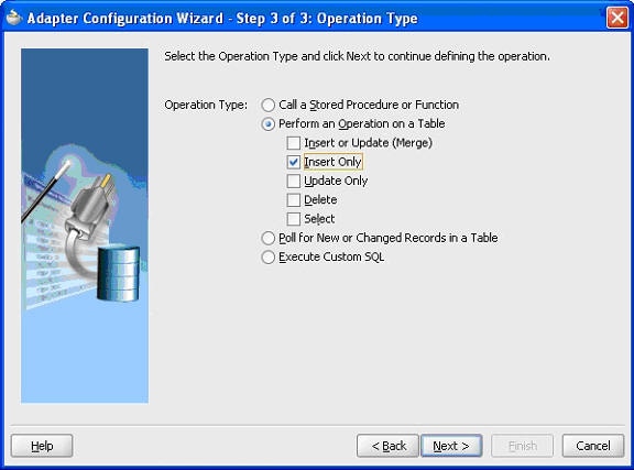 4. Step 3: Select Perform an Operation on a Table as the operation type. Select Insert Only and deselect all other options.