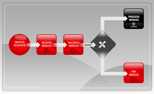 The process is initiated when an invoice is received. The invoice is then automatically validated. In the case of a valid invoice, the invoice is paid. Otherwise, a human workflow starts in which the invoice will be manually processed.