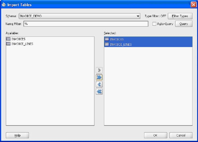 5. Step 4: Click Import Tables… to open a dialog box in which you can select the invoice tables. Click Query to get an overview of all tables in the INVOICE_DEMO schema (there should be only two tables). Select both the INVOICES and INVOICE_LINES tables and shuffle them to the selected widget. Back in the Select table dialog box, select INVOICES as the root database table because this is the master table.