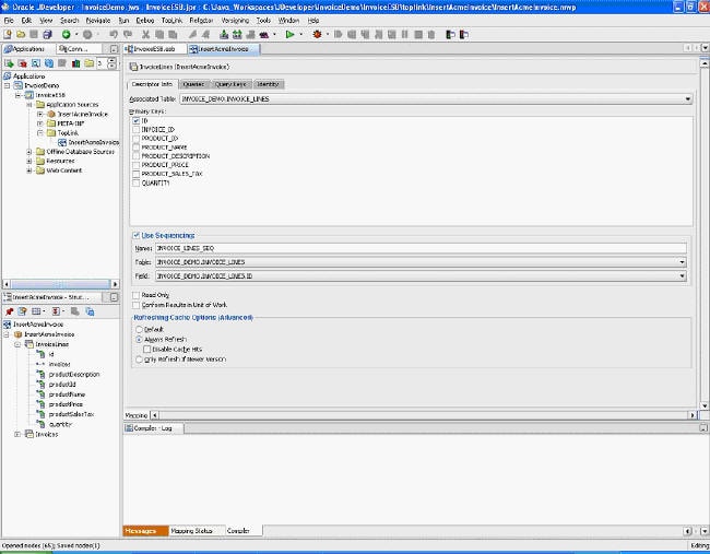 To verify whether this is the case, open the InsertAcmeInvoice_toplink_mappings.xml file located in the project’s root directory, in an external text editor. Search for the <toplink:sequencing> element. This element should appear twice—once for every invoice descriptor/table (INVOICES and INVOICE_LINES). If no such elements can be found, do the following: