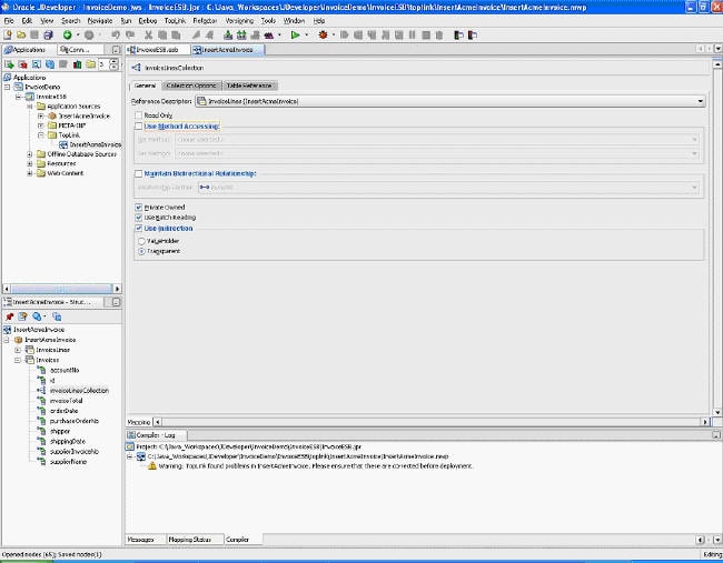 11. If you compile the project by right-clicking it in the Applications Navigator and selecting Rebuild, you might get the warning TopLink found problems in InsertAcmeInvoice. You can resolve this warning by expanding the Invoices descriptor of the InsertAcmeInvoice map in the Structure window, selecting the invoiceLinesCollection mapping, and deselecting Use Method Accessing.