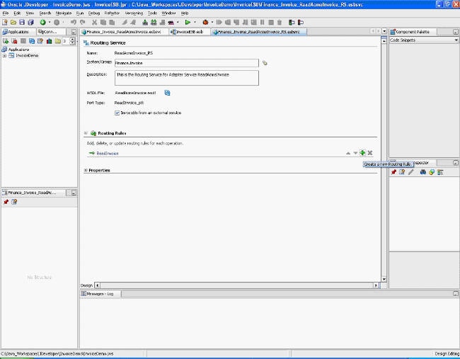1. Open the ReadAcmeInvoice_RS routing service by double-clicking it in the ESB Designer. The routing service has a single operation, ReadInvoice, with no routing rules. (Note that the option Invocable from an external service is selected by default. This means that during deployment of the ESB project a Web service will be created that, if executed, invokes this routing service. This web service is listed in Oracle Application Server Enterprise Manager if you navigate to the Web Services tab of the OC4J instance in which the ESB is deployed. This feature can be used for testing purposes. If you do not require the routing service to be externally invocable you can deselect the Invocable from an external service option.)