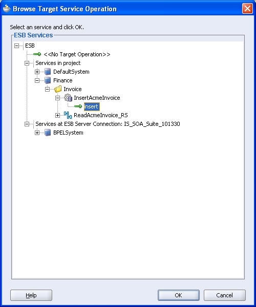 5. Figure 26 Selecting the insert service of the InsertAcmeInvoice adapter as the target service