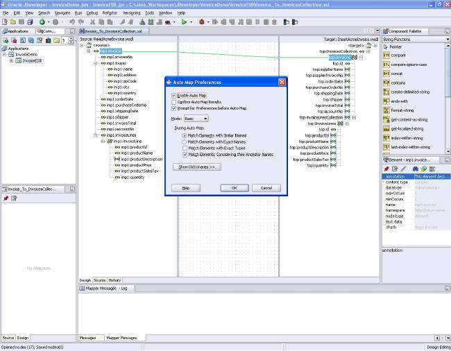 8. Try the auto-complete functionality by dragging the imp1:invoice element from the left onto the top:Invoices element on the right. The Auto Map Preferences dialog box appears.