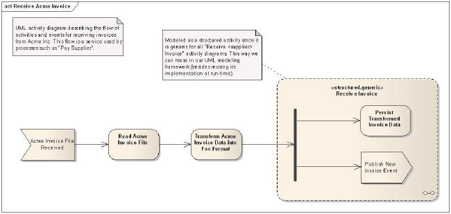 The activity diagram is split into an Acme-specific part (from start activity to transform activity) and a generic part that applies to all types of incoming invoices. This promotes both design-time and runtime reuse.