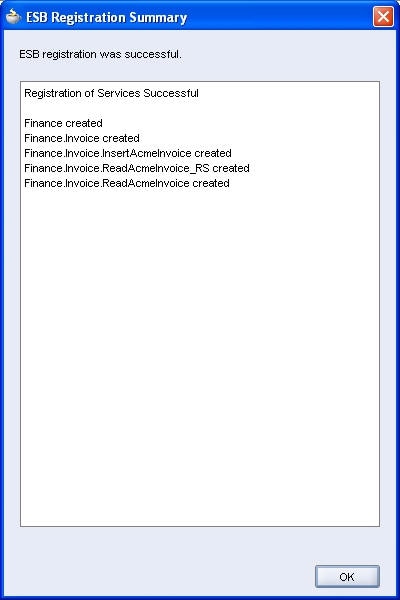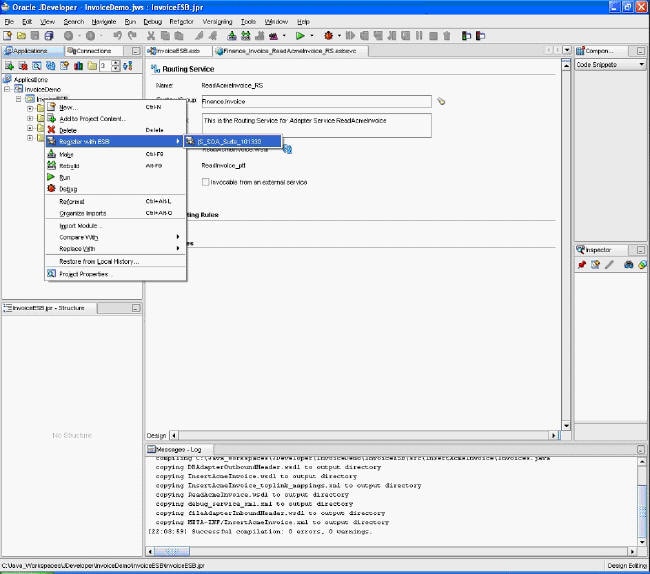 Deploy the ESB project to Oracle Application Server by right-clicking the project in the Applications Navigator and selecting Register with ESB. Oracle JDeveloper will inform you that the Finance system, Invoice service group, and adapter and routing services are created on the server.