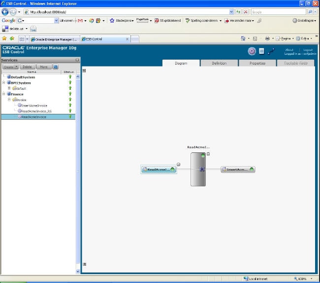 With this article, you have implemented such a service using Oracle ESB by composing multiple, already available adapters and routing services into a flow used for processing invoices. This is done based on open standards such as Web services and various other Java and XML-related standards.