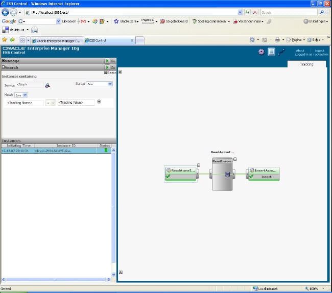 Open to the ESB Control to view the registered ESB flow. Select Start → Programs → Oracle – <SOA Suite instance name> → Oracle ESB → ESB Console. This will open the ESB Control in a browser window.