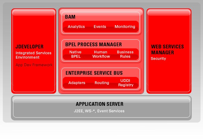 The position of the previously named components in an overall, high-level Oracle SOA platform is depicted below.
