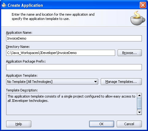 1. In Oracle JDeveloper, create a new application workspace to hold your application. Right-click Applications in the Applications Navigator. Select New Application… and enter InvoiceDe mo as the application name. Accept the defaults and click OK to create the application. Select Cancel in the Create Project dialog box.