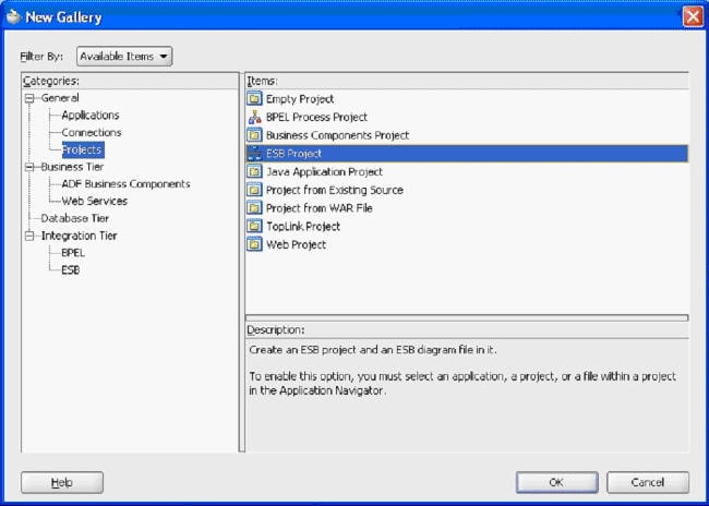 3. In the Applications Navigator, right-click the newly created application and select New Project…. Select General → Projects → ESB Project from the New Gallery dialog box. Enter InvoiceESB as the project name, accept all other defaults, and click OK. Oracle JDeveloper will create a new ESB project containing a jpr and an esb file. The esb file, named InvoiceESB.esb, is automatically opened in the ESB Designer.