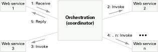 In orchestration, which is usually used in private business processes, a central process (which can be another Web service) takes control of the involved Web services and coordinates the execution of different operations on the Web services involved in the operation. The involved Web services do not "know" (and do not need to know) that they are involved in a composition process and that they are taking part in a higher-level business process. Only the central coordinator of the orchestration is aware of this goal, so the orchestration is centralized with explicit definitions of operations and the order of invocation of Web services. (See Figure 1)