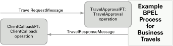 Next, we have to expose the business travel BPEL as a Web service. The second step is therefore to define the WSDL for it. The process has to receive messages from its clients and return results. It has to expose the TravelApprovalPT port type, which will specify an input message. It also has to declare the ClientCallbackPT port type, used to return the result to the client (asynchronously, using a callback). This process is illustrated in Figure 6.