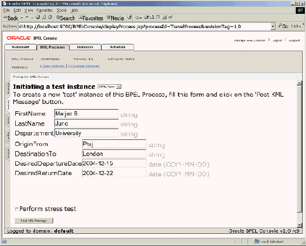 Now that you have successfully deployed a BPEL process on the Oracle BPEL Server, it's time to execute it. Oracle BPEL Process Manager provides a BPEL Console through which you can execute, monitor, manage, and debug BPEL processes on a BPEL Server domain. The BPEL Console is accessible at http://localhost:9700/BPELConsole/. You have to click the process name, fill out the following form and click on the Post XML Message button: