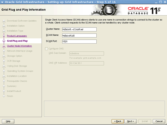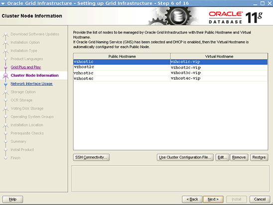 vzhost1d, IP address 10.134.35.99, is used for the SCAN IP address.vzhost1c-vip, IP address 10.134.35.100, is used as the VIP address for vzhost1c.vzhost2c-vip, IP address 10.134.35.101, is used as the VIP address for vzhost2c.vzhost3c-vip, IP address 10.134.35.102, is used as the VIP address for vzhost3c.vzhost4c-vip, IP address 10.134.35.103, is used as the VIP address for vzhost4c.Note: Do not manually plumb these IP addresses anywhere, including in the cluster, on the network.