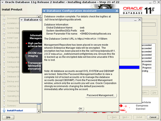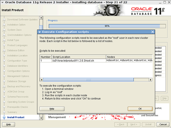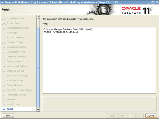 root.sh script on the last node, click OK to continue.The Finish page, shown in Figure 20, shows that the installation and configuration of Oracle Database is complete.