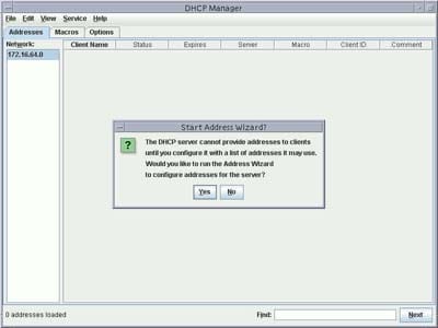 The DHCP Manager appears and you are asked to start the Address Wizard:
