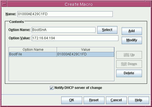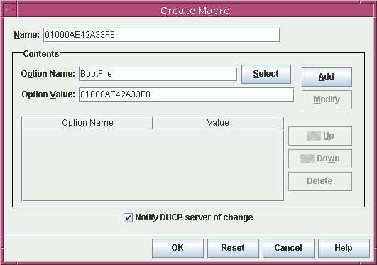 BootSrvA portion of the macro by typing the network IP address of the JumpStart server into the Option Value field. After typing the information, click Add. Then click OK to complete the creation of the first macro.