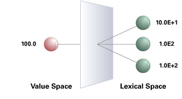 For example, 100.0, 200.0, and so on are values in the value space of datatype float. The value 100.0 can be represented using multiple literals such as 10.0E+1, 1.0E2, 1.0E+2, and so on. Similarly, the value 200.0 can be represented using multiple literals such as 2.0E2, 2.0E+2, and so on. All such literals for every value in the value space of float belong to the lexical space of datatype float. (See Figure 1.)
