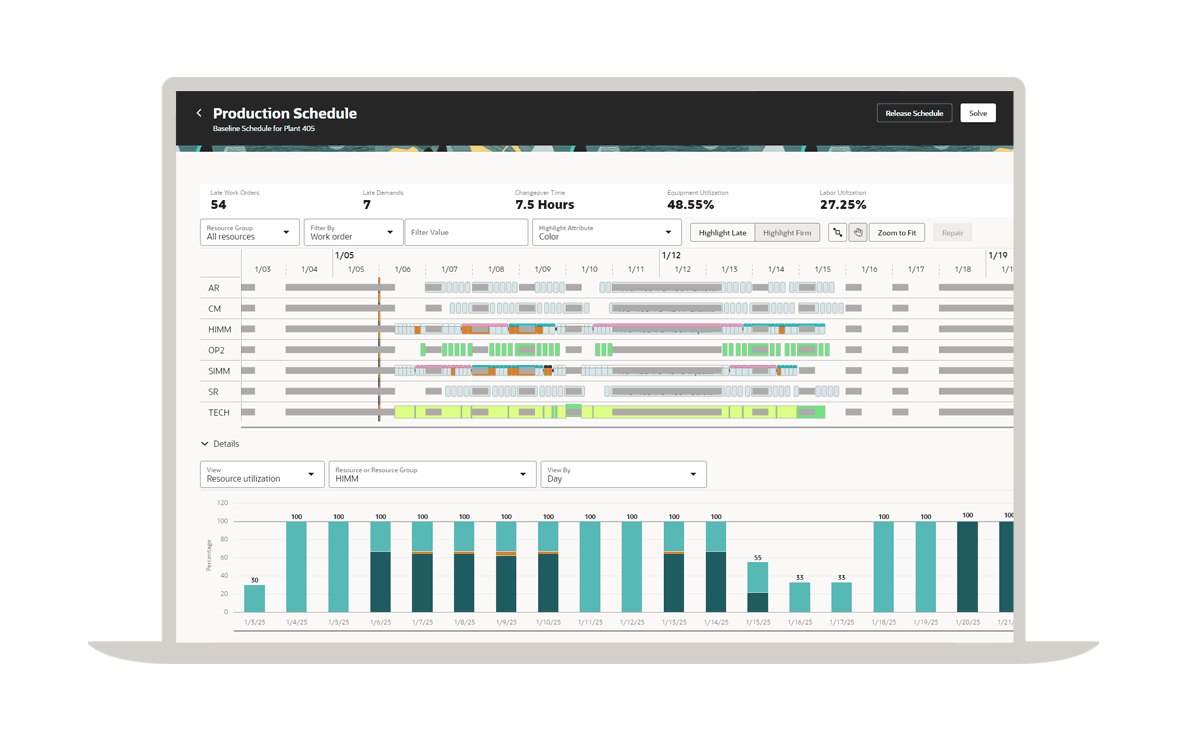 Oracle Supply Planning 在白天安排生產,以充分利用瓶頸資源,提高工廠產能並改善交貨表現。該解決方案根據即時車間事件,主動調整工廠的工作排序和時間,以減少換線、降低庫存、避免浪費並加速交貨。