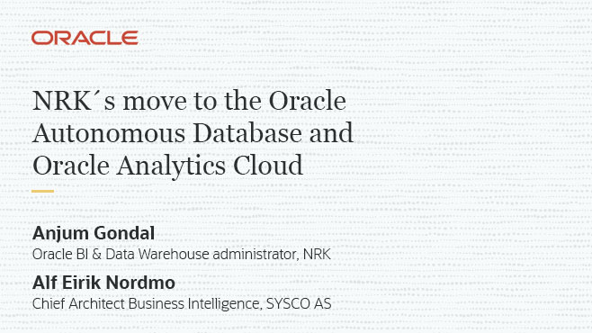 NRK is the Norwegian state owned broadcaster and a major player in the country media landscape. They needed tight cost- and budget control so they decided to move the entire data warehouse workload to Oracle Autonomous Data Warehouse Cloud and Oracle Analytics Cloud.