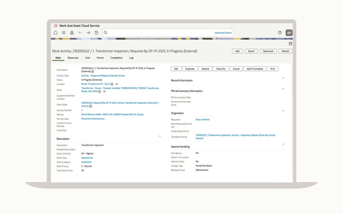 Oracle Work and Asset Management Cloud is an industry-leading enterprise asset management solution that helps electric, water, and gas utilities maintain and mange utility-owned assets. This end-to-end solution delivers mission-critical benefits, enabling you to:
