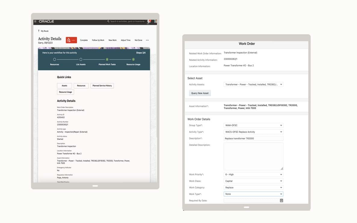 The out-of-the-box integrations of Oracle Utilities Work and Asset Cloud Service (WACS) and Oracle Field Service provide a single comprehensive platform for managing both your assets and your field service workforce.