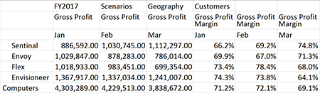 In the visualization, trends stand out, and the “bigger picture” and categorical breakdowns are revealed with a full year-over-year comparison and additional product category break down of Gross Profit - illustrating the benefits of visualization vs straight data. Possibilities are endless and easy to add or remove.