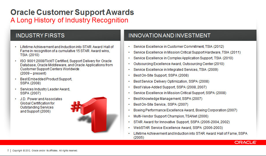 Oracle provides best-in-class technologies at every layer of the IT stack and complete, integrated solutions. Oracle and our worldwide community of more than 21,000 partners stand ready to help you get up and running quickly. From there, Oracle Premier Support helps you get ahead and, more importantly, stay ahead.