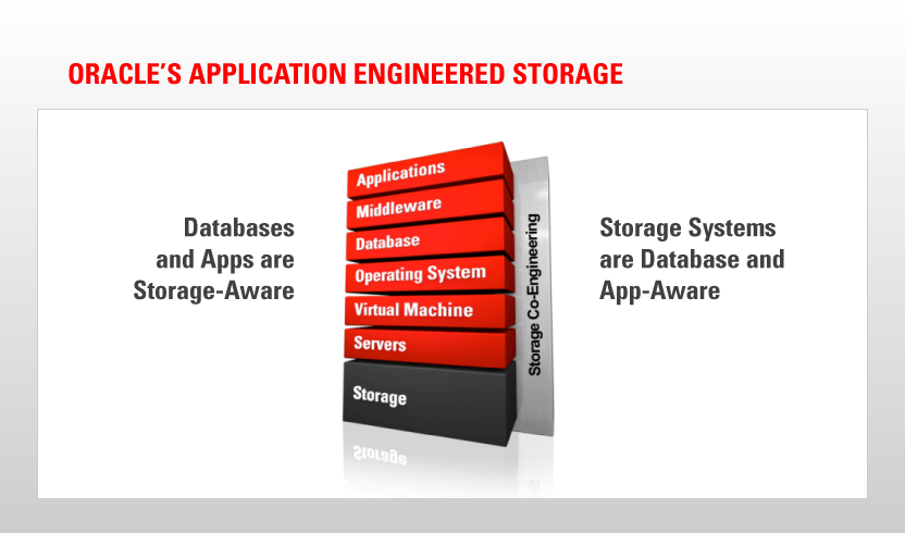 Application Engineered StorageOracle is addressing these challenges with a new breed of storage – application engineered storage. Its portfolio of storage systems are co-engineered with other parts of the Oracle software stack, helping enterprises achieve higher levels of business performance, simplified deployments, reduced risk, and environments that run Oracle software faster and more efficiently.