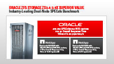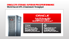 Analyst Report: "The latest version—ZS3—has a trifecta of advantages: the prerequisite enhanced performance and scalability that is the wont of all new storage systems, a surprisingly inclusive set of functionalities (including class-leading analytics), and an extended group of “better together” elements that make this a particularly compelling offering for Oracle Database users."Mark Peters, ESGRead the Analyst Report2 Results as of September 10, 2013. Results for Oracle ZFS Storage ZS3-4 are 17,244.22 SPC-2 MBPS™, $22.53 SPC-2 Price-Performance. Results for IBM DS8870 are 15,423.66 SPC-2 MBPS, $131.21 SPC-2 Price-Performance. Results for HP P9500 XP Disk Array are 13,147.87 SPC-2 MBPS, $88.34 SPC-2 Price-Performance.