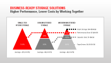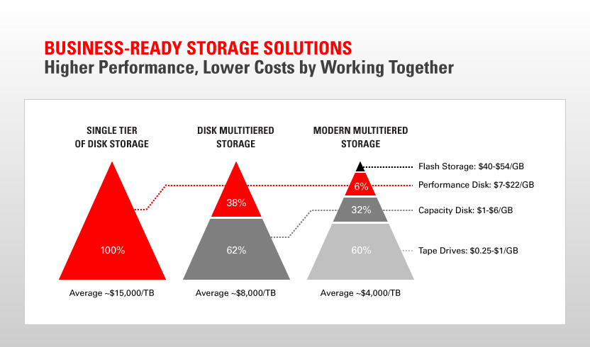 Moving from a single tier of tier-1 storage to Flash, performance disk, capacity disk, and tape results in faster performance and a 75 percent savings in storage expenditures.15