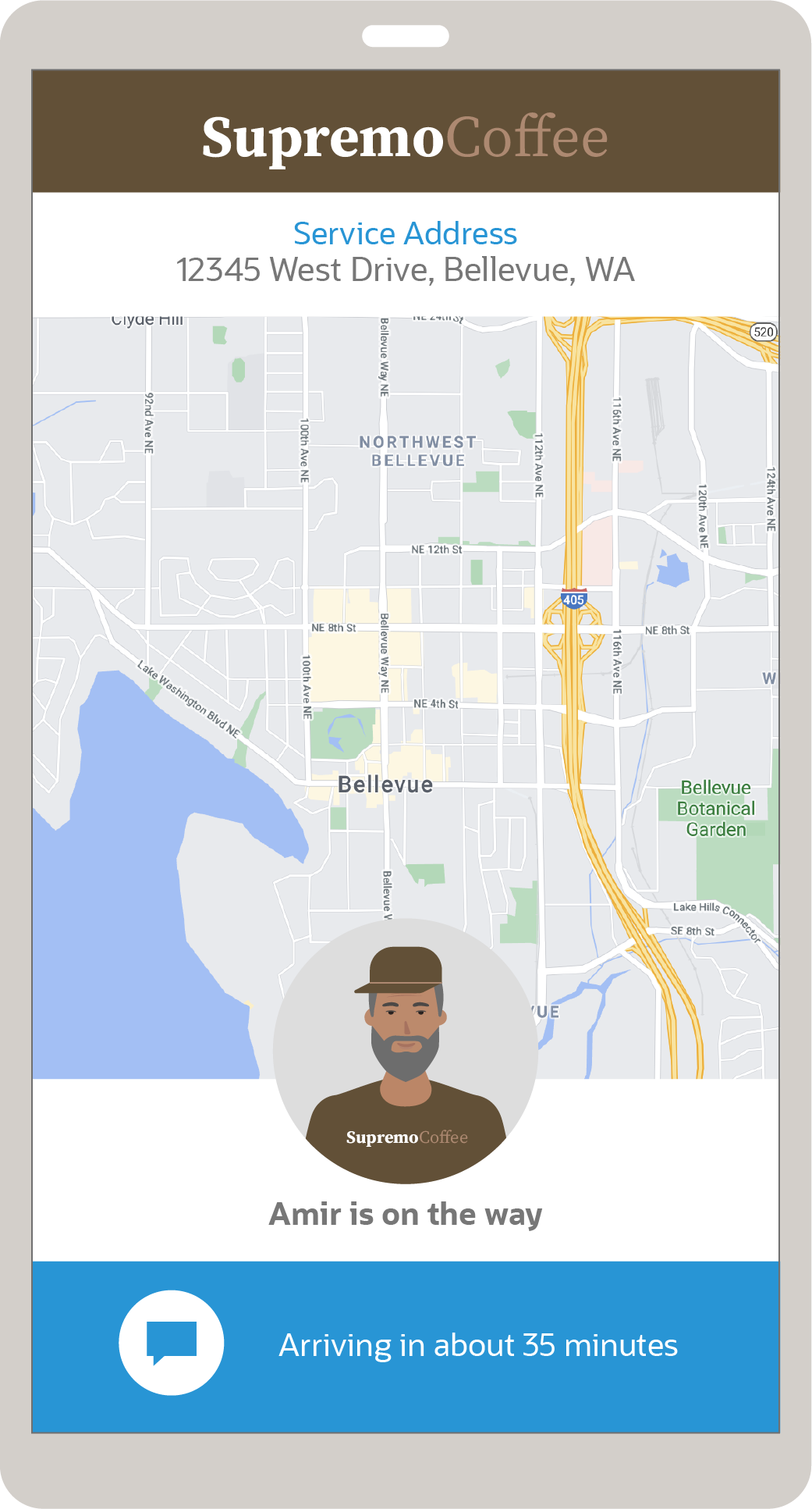 As the appointment nears, Sofia receives another message with a link to view and track Amir, the Supremo Coffee service team member, on the way to her home.