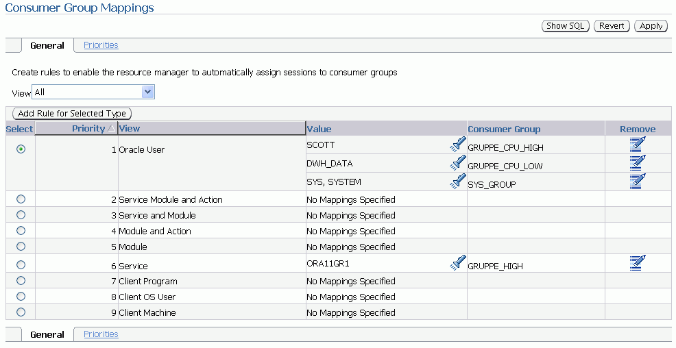 Im Beispiel wird Oracle User als eine Mapping Regel für die Resource Consumer Groups SYS_GROUP, GRUPPE_HIGH_CPU und