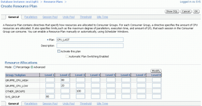 Folgende Abbildung zeigt das Anlegen des Resource Plans CPU_LAST.