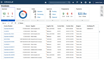 The Invoices work area for the Accounts Payable Manager increases efficiency and productivity by speeding the processes to complete scanned invoices, resolve invoice holds, approve invoices, make prepayments, and pay invoices coming due.