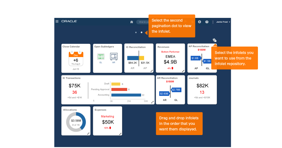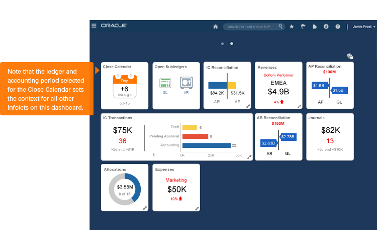 Oracle Financials Cloud now provides infolets and work areas that deliver instant insight into your business, organize common financial activities and pinpoint issues that require attention.