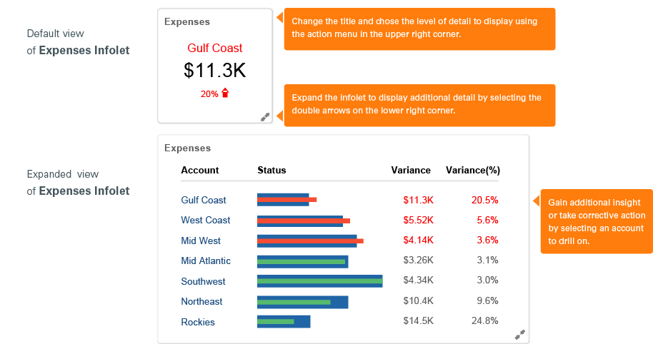 Configure infolets according to your needs. Customize titles, adjust filters, and select the summary information and additional details to be displayed. Infolets also drill to supporting pages, functions, and reports.