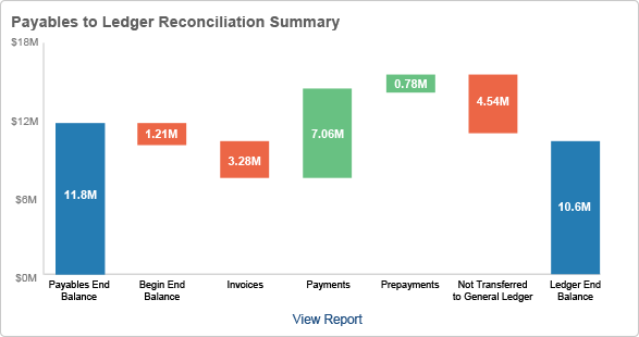Accelerates reconciliations by analyzing differences between the ledger balance and subledger balances of payables accounts. Links to the reconciliation report for the transaction details needed to resolve variances.